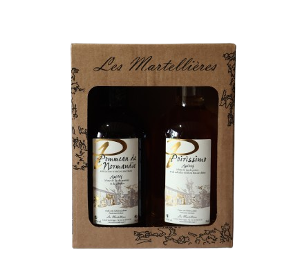 Vous hésitez entre le Pommeau et le Poirissimo ? Voici une idée de coffret cadeau pour découvrir nos 2 apéritifs à base de pomme (pommeau) et de poire (poirissimo).